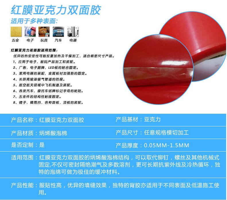 防潮,抗溶劑性,高低溫循環周期性且吸震力高。壓克力膠帶可有效減輕重量,取代螺絲、鉚釘、焊接,同時固定及密封。具有極佳的填縫效果,隔絕濕氣、灰塵、及化學物質;耐久性、耐候性優異;抗震抗老化、抗UV抗溶劑、降低噪音。超強的粘性,不論是塑膠表面、金屬表面、玻璃表面、凹凸不平的壁面都能起到粘接牢固的效果。