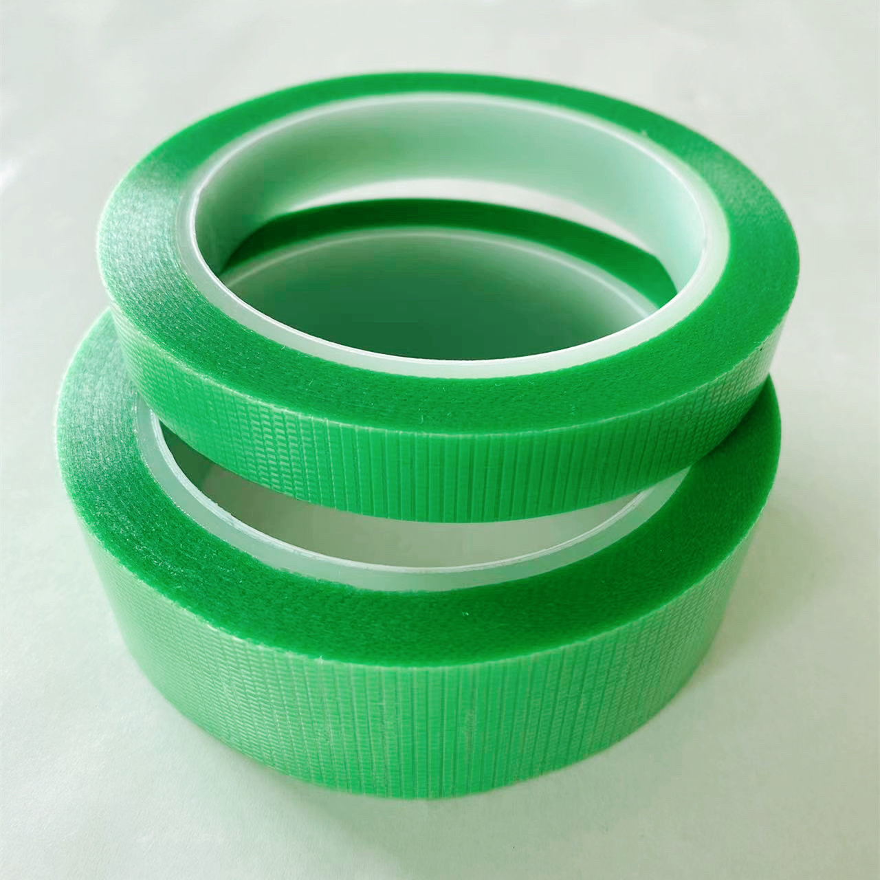 該膠黏帶以PE和PET為基材,進口耐溫樹脂為涂層。經涂布設備后進150℃烘箱進行高溫塑化后生成穩定的高分子壓敏膠層。