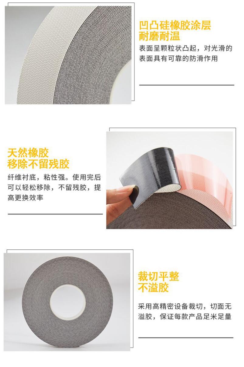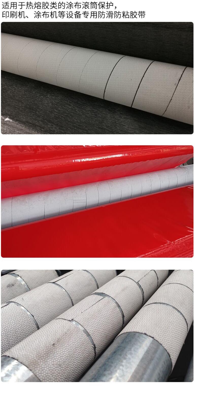 防粘膠帶系特種低表面能橡膠材料做成,此材料的表面張力較低,可以有效防止膠粘劑對其的粘接作用。且具有一定的厚度,即使表面經摩擦而損壞,但因整個材料都有防粘效果,露出的表面仍然有防粘作用。防粘膠帶反面涂有特殊的壓敏型膠粘劑,能將膠帶牢牢地粘附在一般材料上,包括難粘的硅橡膠。防粘膠帶主要用在一些設備的某些傳動輥需要接觸涂膠面、印刷面。未干燥的印刷面易沾污輥筒而影響產品的表面圖案。而涂布壓敏膠的涂布機接觸膠面傳動輥大多采用表面包覆硅橡膠來解決防粘問題。 防粘膠帶包覆的滾筒嚴重磨損后可即刻重新纏繞,輕松方便。更重要的一點是防粘膠帶的效果大大的超過硅橡膠,使原來生產時經過輥筒產生的噪音及拉扯膠面的現象全部消除了。