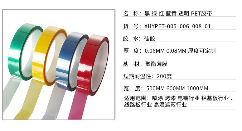 基材:聚酯薄膜 膠型:進(jìn)口有機(jī)硅壓敏膠。顏色多樣。常用厚度規(guī)格分:0.05MM、0.06MM、0.07MM、0.08MM、0.1 MM;0.15MM特殊厚度產(chǎn)品可訂 。