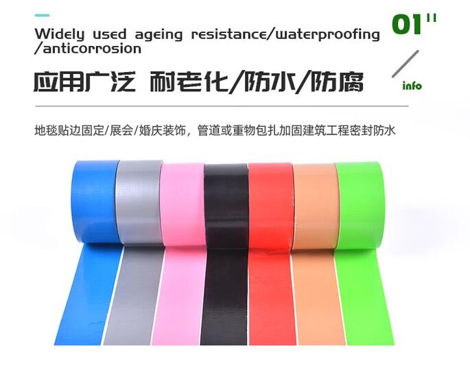 按顏色可分為:黑色布基膠帶、銀灰色布基膠帶、綠色布基膠帶、紅色布基膠帶、白色布基膠帶、土黃色布基膠帶。